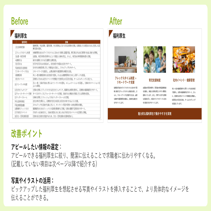 Before:福利厚生が充実していることは企業にとってアピールの一つとなりますが、それらを1ページに全て記載してしまうと重要な項目が埋もれ、読みづらくなってしまいます。