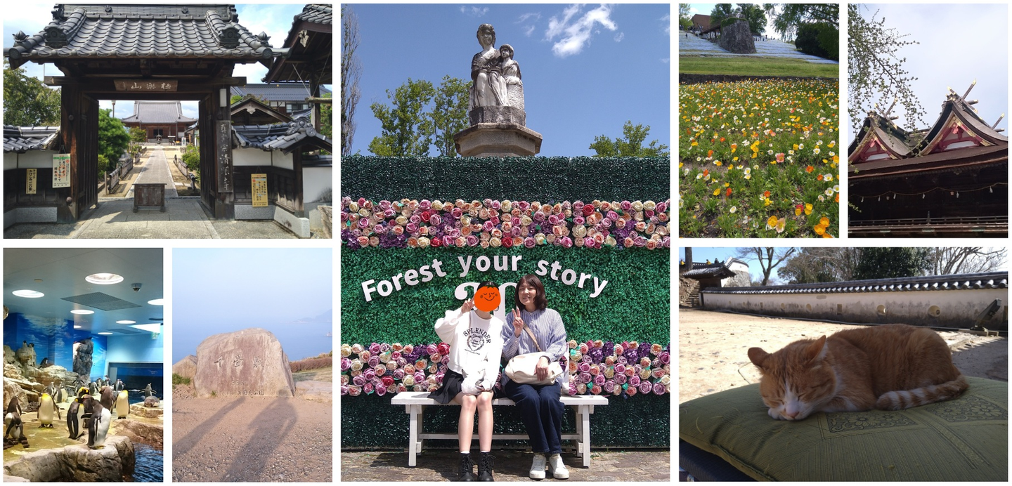 神社仏閣や、動植物など自然が多い場所に出かけることも好きです。写真中央とその右側の花畑は『おかやまフォレストパーク ドイツの森』という場所です。自然も満喫できて、カンガルーなどの動物とも触れあえ、旬のおいしいものが味わえるのでおすすめです!