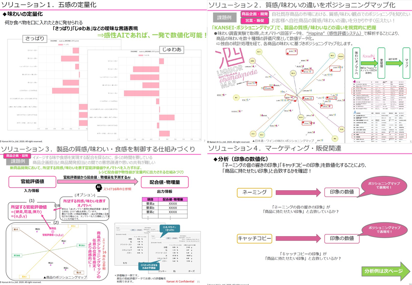 感性AIでは、ヒトがモノから感じる印象を精緻に数値化する技術を有しているので、深層学習(ディープラーニング)を活用しながら、この官能評価の分野の省力化や精度平準化等に資するサポートをさせていただいています。