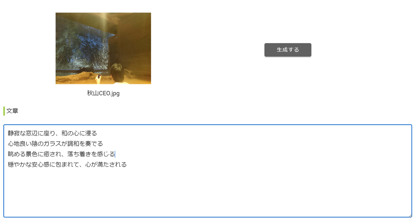この機能は、写真をアップロードするだけで、その写真から想起された情緒的な文章を生成するというものです。