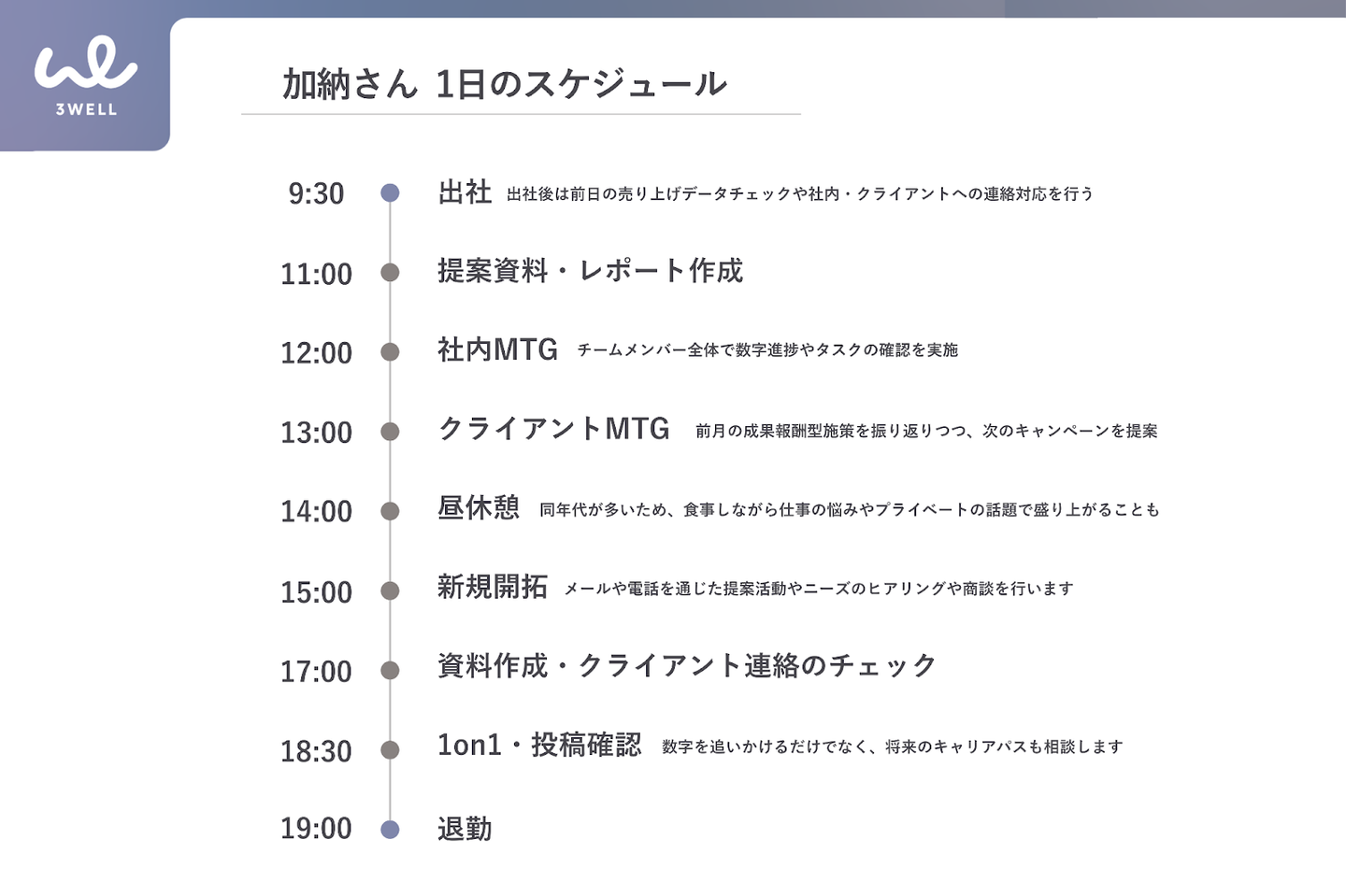 今回は「セールス職」「ディレクター職」のメンバーに密着し、1日のスケジュールや日々どのような業務をこなし、どんな視点で仕事に取り組んでいるのかを紹介します!