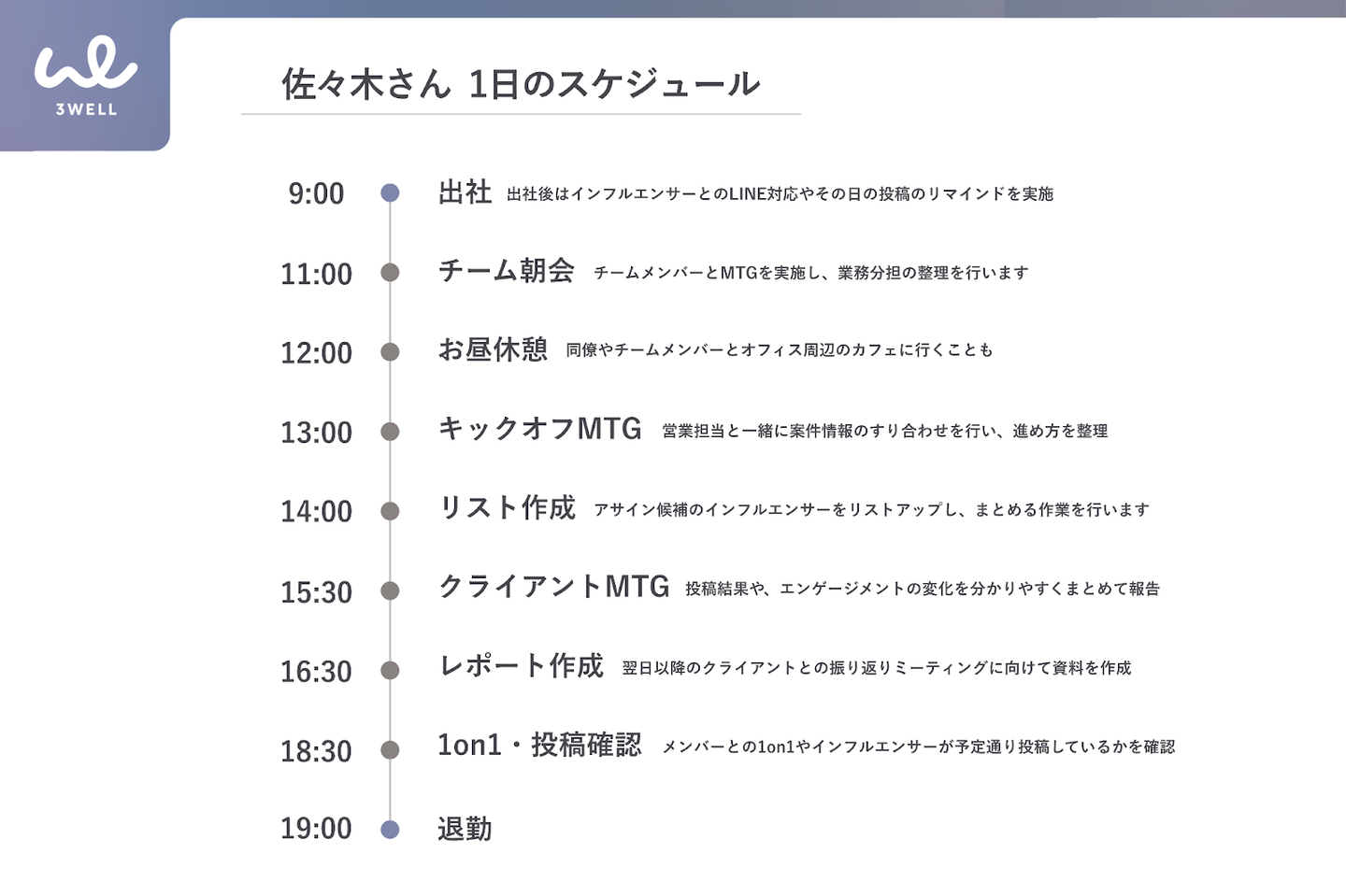 変化を楽しめる人だと思います。SNSの世界はトレンドの移り変わりが早いし、ベンチャーの社内体制もアップデートが頻繁。決まったレールを淡々と進むより『面白そうだからやってみよう』と主体的に動けるタイプなら、3WELLを楽しめるのではないでしょうか!