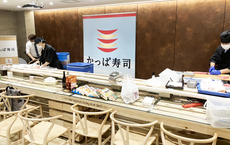 5mのレーンを持ってきていただき、お皿もお寿司もお醤油も全てご用意いただき、プロの職人さんが握ってくれますので、私たちで用意するものはドリンクのみ!