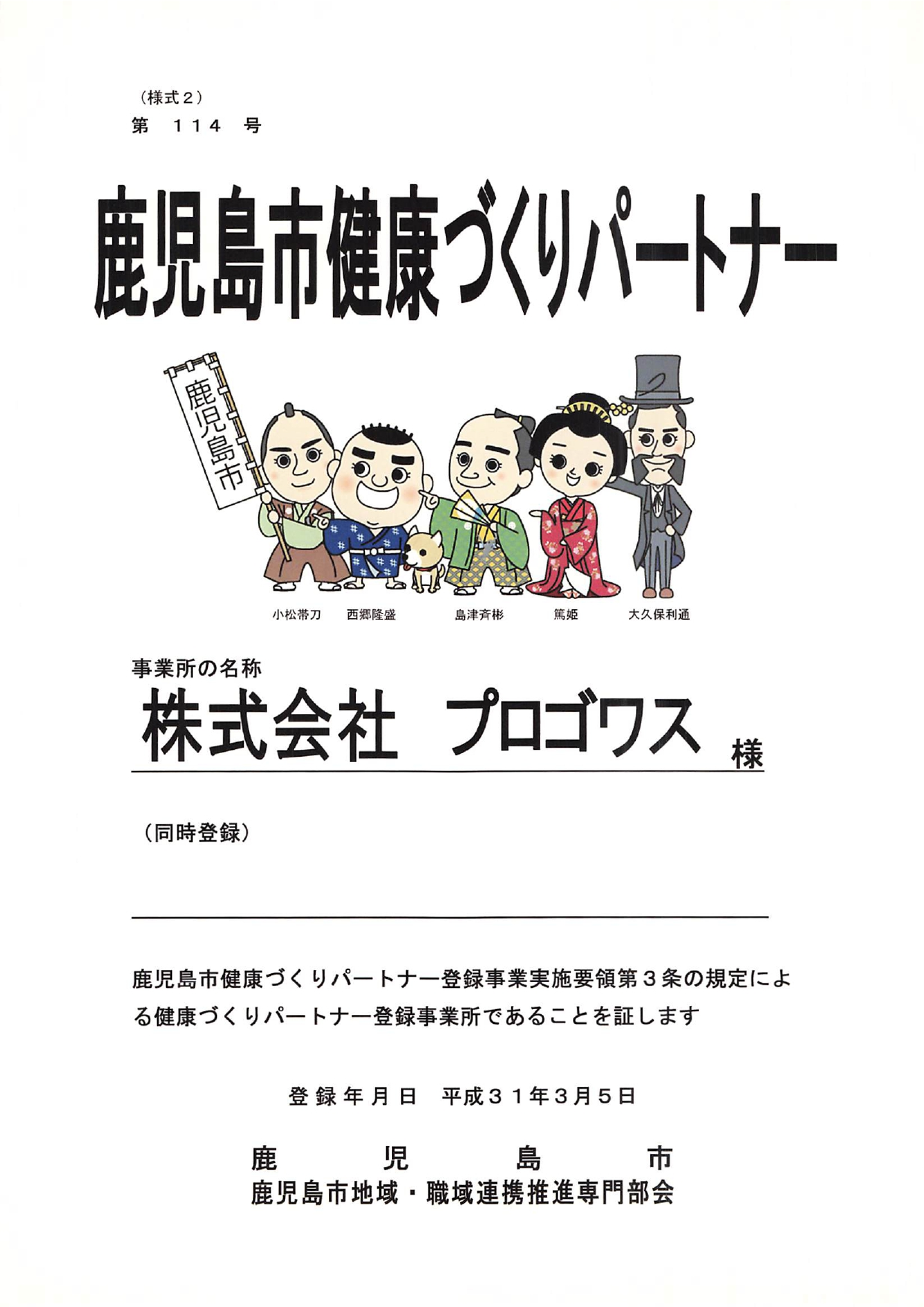 2019年3月5日、従業員や家族の健康づくりに取り組む鹿児島市の「健康づくりパートナー」に登録しました。さらに、同年12月24日には「鹿児島健康企業宣言」を行い、健康への意識を一層 高めてきたプロゴワス。常に社員の健康を気遣い 様々な活動を牽引してきたのは、他でもない社長でした。