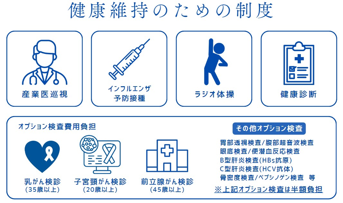 毎年11月頃に医療機関のスタッフにお越しいただき、社内でインフルエンザの予防接種を実施しています。接種費用はもちろん、会社が全額負担。業務時間内に気軽に受けられるので、毎年社員のほとんどが接種しています。自分で病院を予約して、お休みの日に病院へ行って…という手間と費用を考えれば、本当にありがたい制度です!
