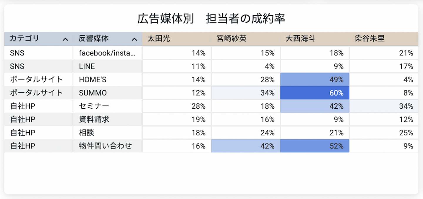 ほぼ全ての不動産営業にはそれぞれ得意な顧客層とそうでない顧客層があり、例えば女性単身層に対しては、3人に1人は成約に至る営業が、ファミリー層に対しては10人に1人しか成約できないなどの大きな違いがでることも珍しくありません。また得意とする反響の経由媒体にも差が出ます。