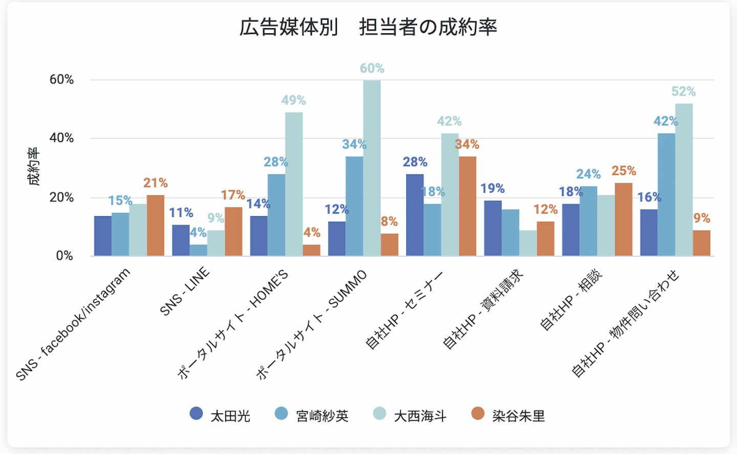 指標1:営業ごとの流入広告媒体別の成約率を可視化し得意媒体にのみ対応することで全体の契約率を大幅改善