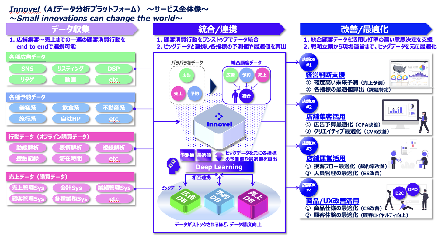 ワンストップで顧客分析が可能になる事で、本当に効果のある広告キャンペーンやメディアの可視化、対応する営業と顧客マッチングの最適化など、データに基づく打率の高い店舗経営を実現する事で、リアル店舗ビジネスのDX推進と業績改善を支援致します。