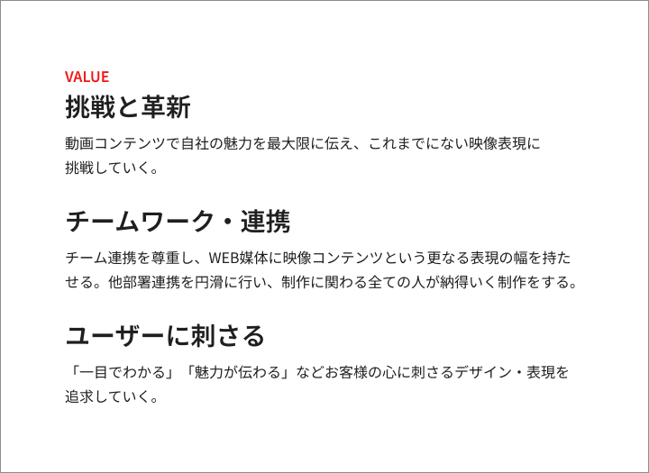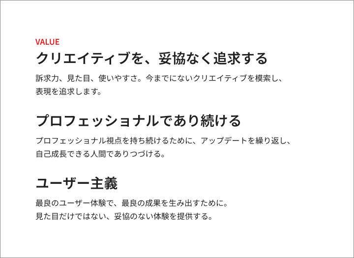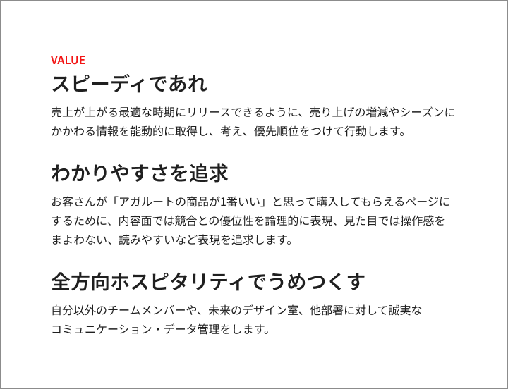 デザインチームとしてのバリューの他にチームごとで行う業務が違うのでそれぞれの業務特性に合わせてバリューも定義しました。