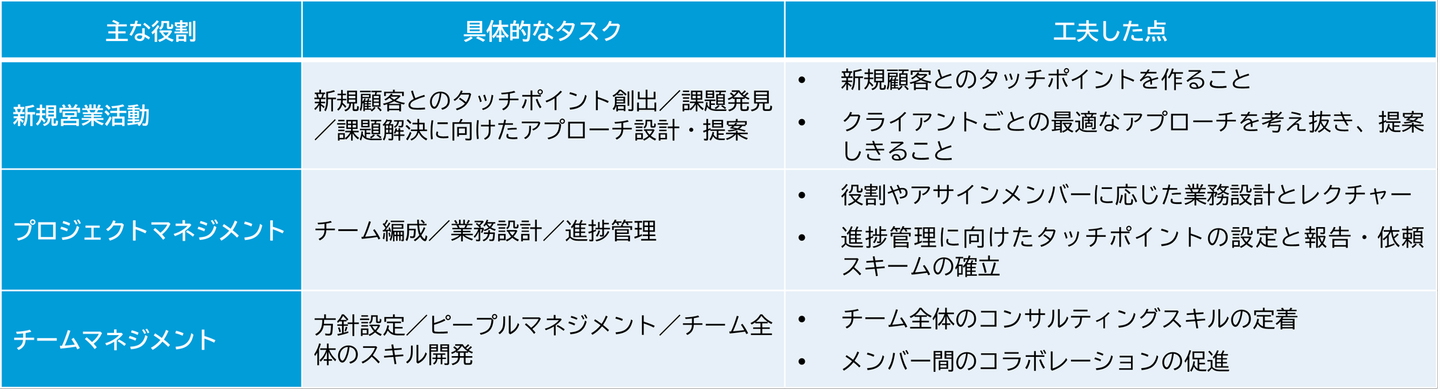 組織目標や課題解決に対して「自分がやり遂げる」という強いオーナーシップを持って挑戦し続けたました。
