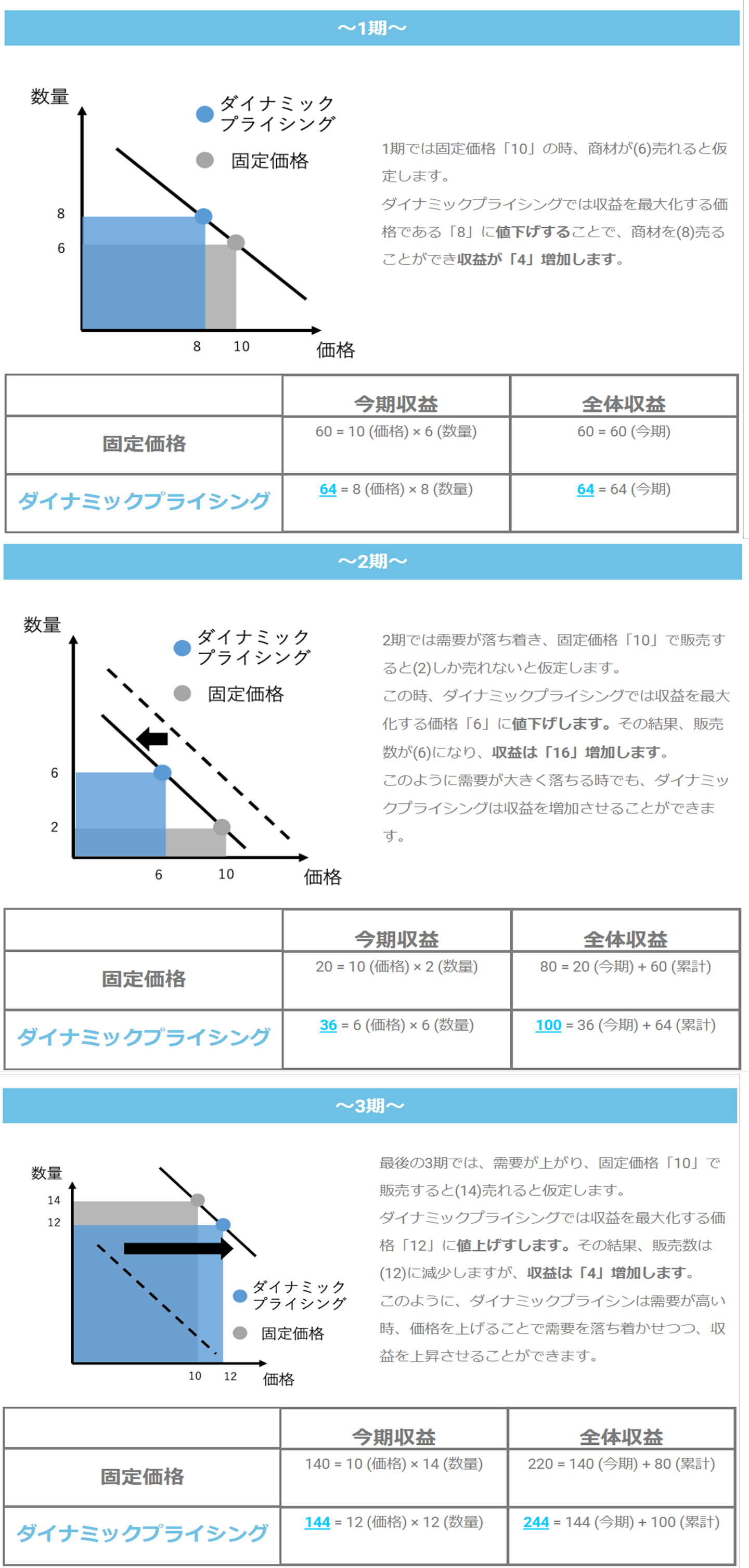 ダイナミックプライシングで収益が増加する仕組みを固定価格の時と比較し説明します。