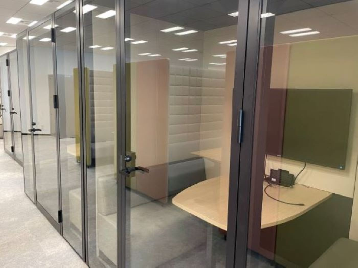 業務に集中するために、防音の個別ブースが5部屋設置してあります。 2〜3名用ブースが2部屋、1人用ブースが3部屋あり、ここで1on1をしたり、出社メンバー&オンラインメンバーのチームMTGなどに活用しています。 1人用ブースは、程よい狭さで周囲の情報や音も遮断されるため、オープンスペースとはまた違った良さがあります。