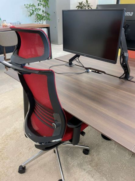 社内はフリーアドレスになっているので、出社したメンバーはどこに座ってもOK。 隣の席ともゆったりした間隔があり、各席にアーム型ディスプレイやコンテッサのオフィスチェアも完備されており、仕事に集中できる環境が整っています。