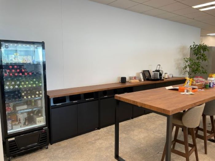 奥にはフリードリンクやメンバーからのお土産も置いてあり、束の間のお茶休憩もできます フリードリンクは、スムージーやプロテイン、黒烏龍茶、コカコーラゼロなど健康を意識したラインアップ! 社員の数も増えれば飲みたいドリンクもみな違う・・・ということで、Slackでフリードリンク投票が行われ、見事勝ち抜いた5~6種類のドリンクが常備されています。 そして冷蔵庫の下には社内懇親会用のお酒もこっそり置かれています。