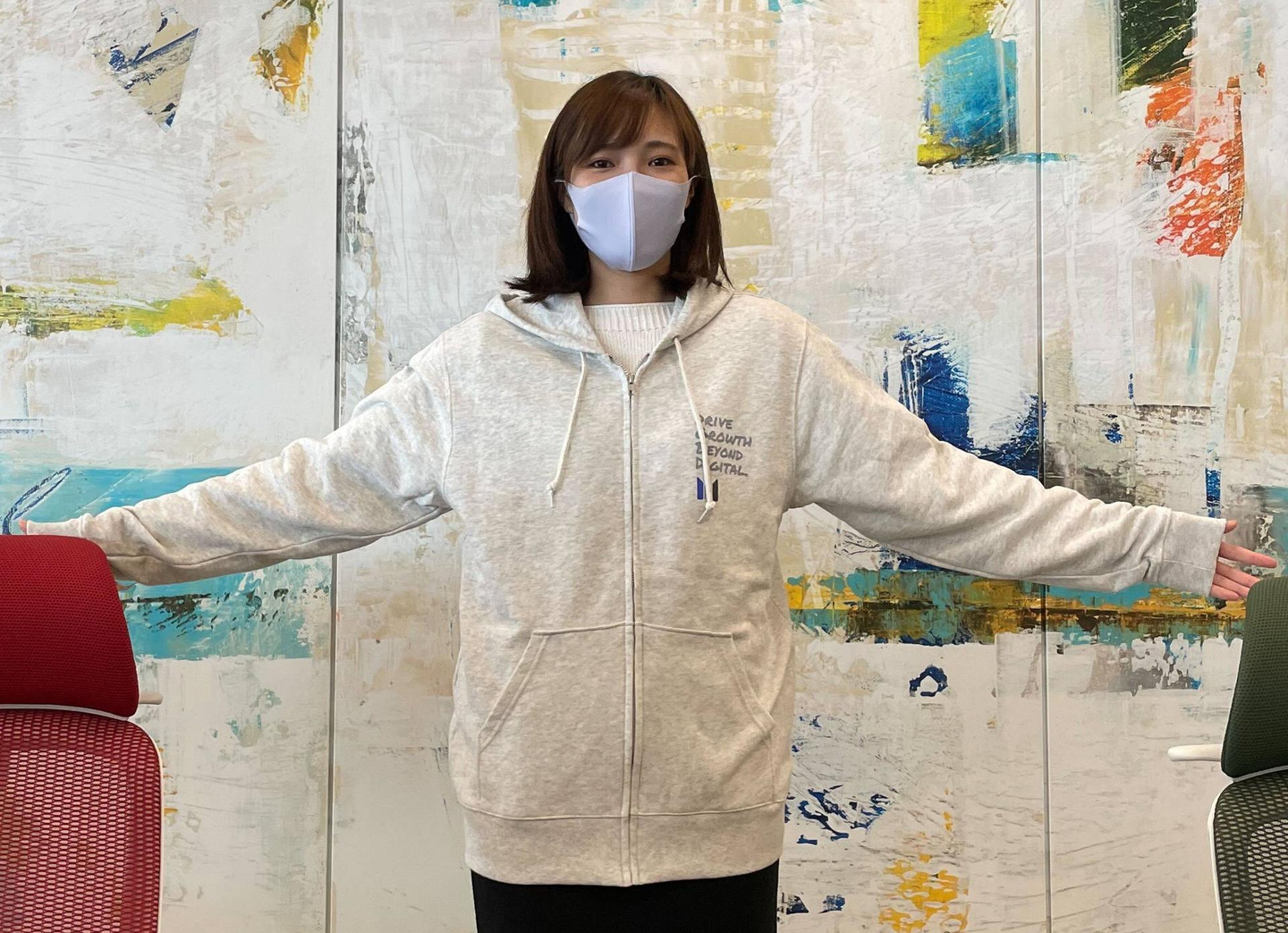 施設に着いてまず初めに、エムシーデジタルオリジナルパーカーをみんなで着用。