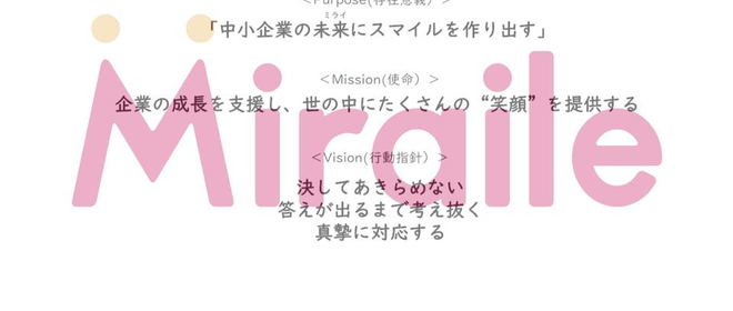 私たちのPurpose(存在意義)は「中小企業の未来にスマイルを作り出す」こと。この「スマイル」こそが、私たちにとっての究極のカスタマーサクセスです。そのため、クライアントの課題解決のためには、「決してあきらめない」姿勢で、一歩踏み込んだきめ細やかな伴走支援を行うことを最優先しています。