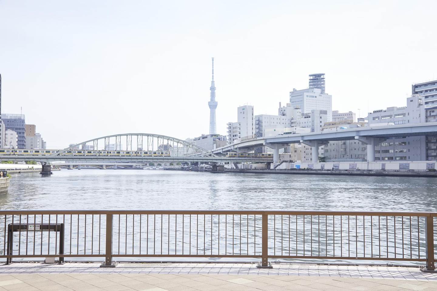(隅田川近くにオフィスを構える当社。川沿いの親水公園からはスカイツリーもくっきり見え