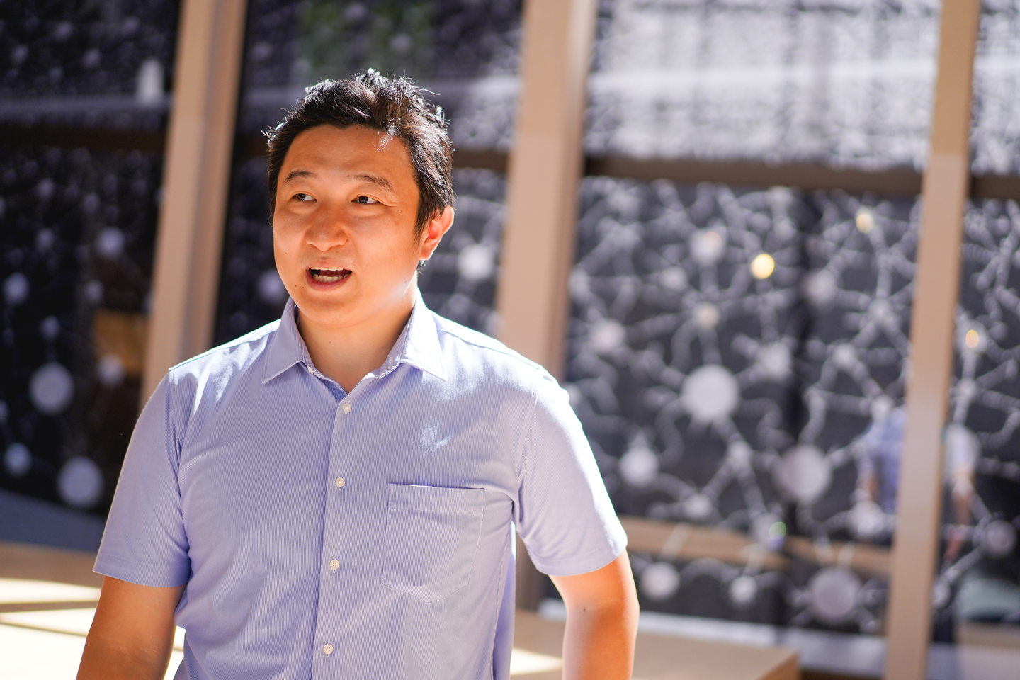 花谷 愼也(はなたに しんや)。本業では新素材開発に従事しつつ、社内副業制度を利用して『RICOH PRISM』プロジェクト(「最大化されたチームワークを体験する」ための、映像や音を駆使した空間づくりプロジェクト)に参加。ブレスト支援ツールである『Brain Wall』の開発に携わる。