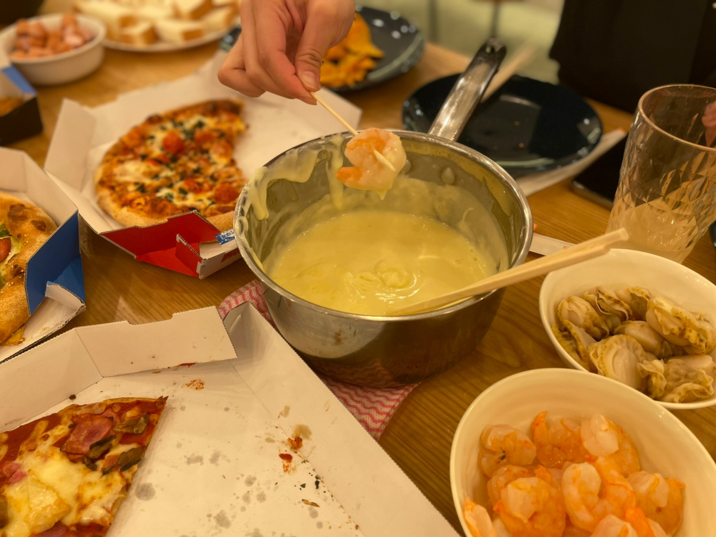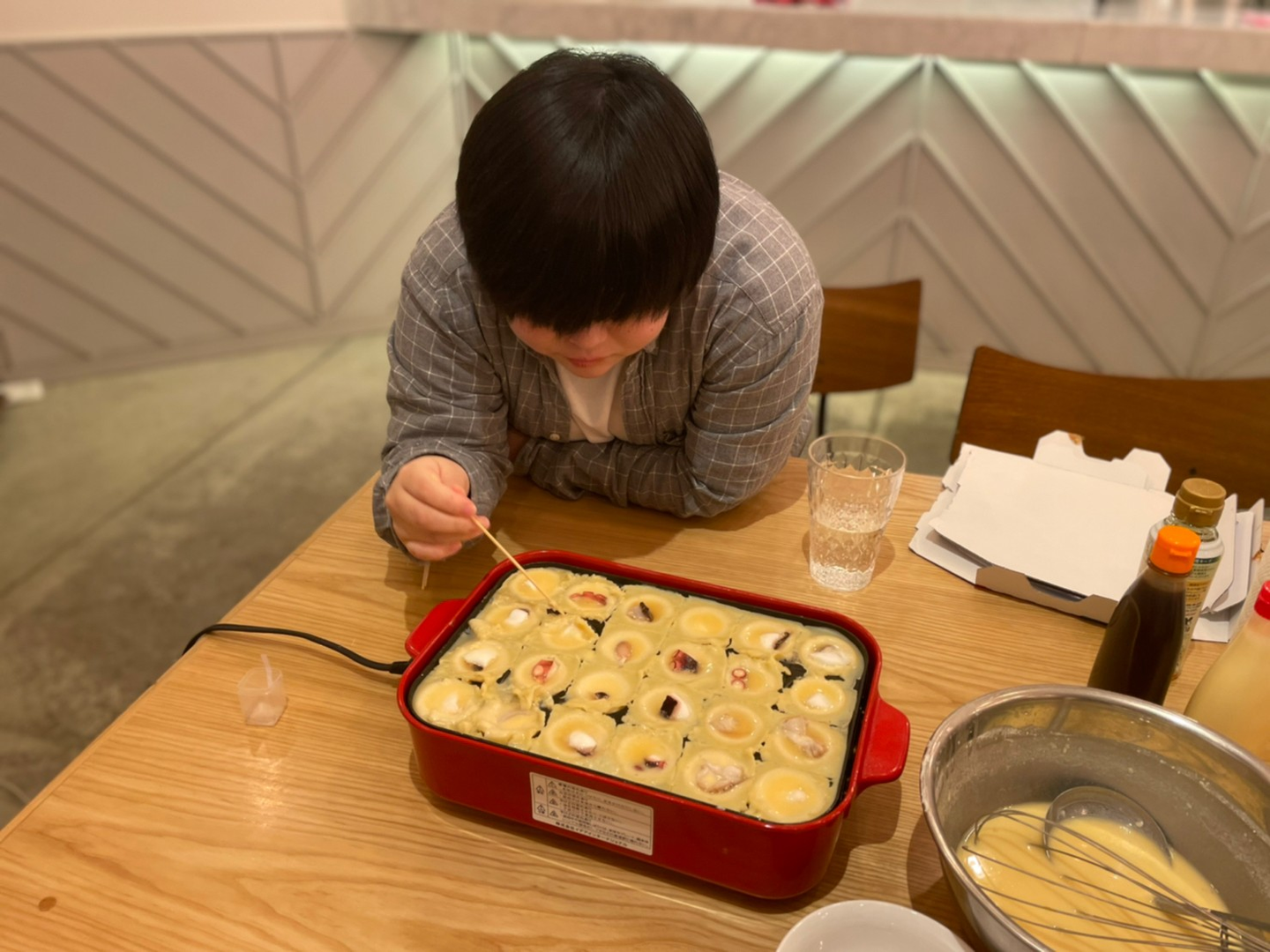 メンバーの発案で「たこ焼き作りとチーズフォンデュ」を行いました。途中、油を買い忘れてトランプのババ抜きで負けた人が買い出し係として活動したり、てんてこ舞いな部分もあったりしましたがたこやき製作所を設けて没頭しているメンバーもいました。作ってくれたたこ焼きの味はとても美味しく、今も思い出してまた早く食べたいなーと思ってしまいました。また、私自身チーズフォンデュを初めて作り食べてみましたがこんなにも美味しいものなのかと感動を覚えました。※チーズと牛乳を適切な割合で混ぜることがポイントだそうです。