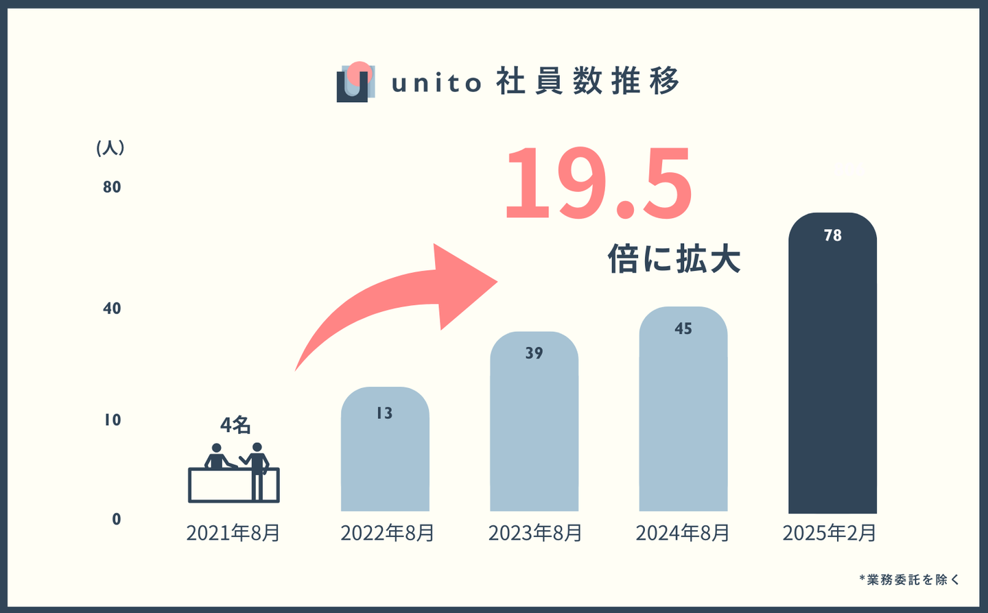 2025年2月現在、従業員数はサービス開始時と比べて19.5倍に拡大!2024年からの組織拡大だけでみても、173%成長!!