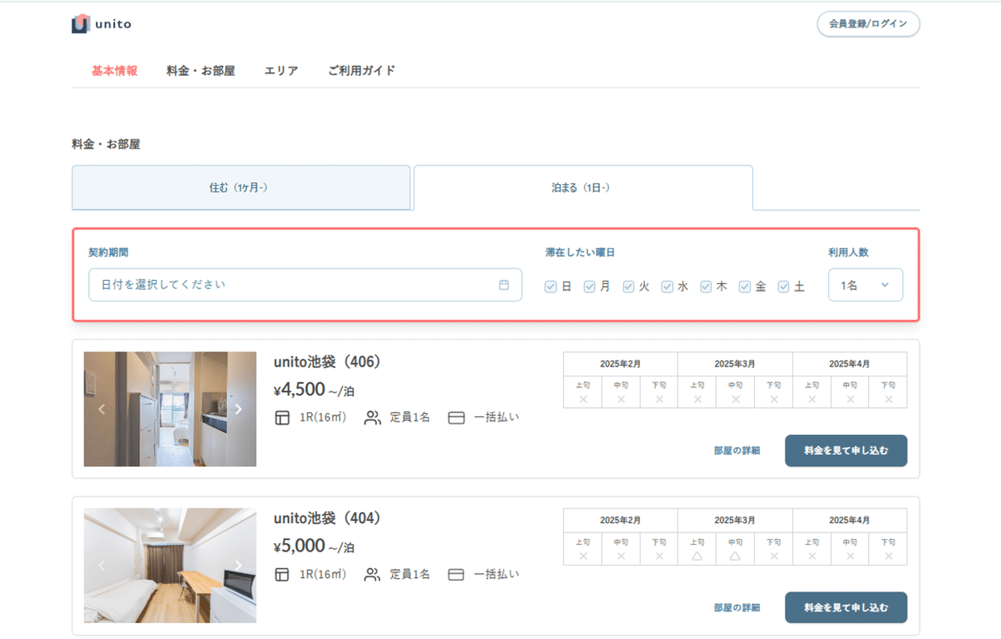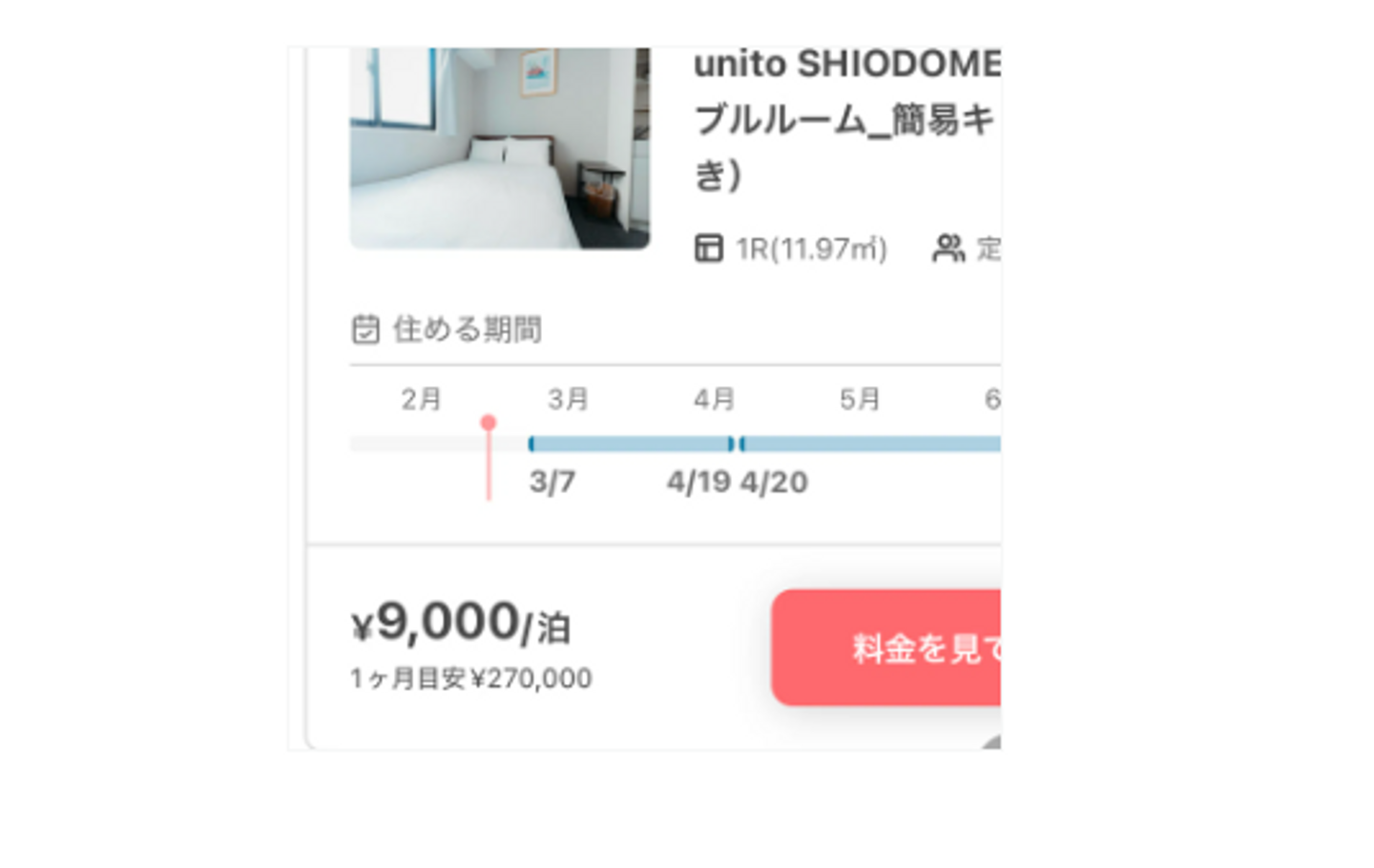 宿泊予約機能はunitoアプリだけでなくwebページにもなかったため、Xカ月前にアプリに先行してwebページで「泊まるプラン」をリリースしました。これにより、unitoの掲載物件をホテルとして予約・利用できるようになりました。