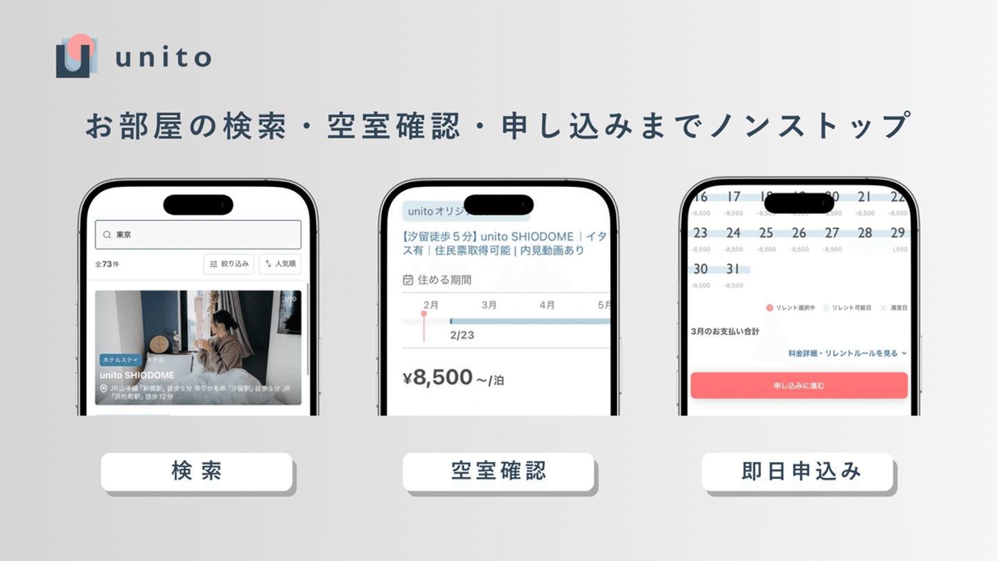 株式会社Unitoのプレスリリース(2025年2月26日 12時00分)Unito(ユニット)、最短即日入居可能なお部屋探しプラットフォーム「unito」スマホアプリ機能を大幅アップデート