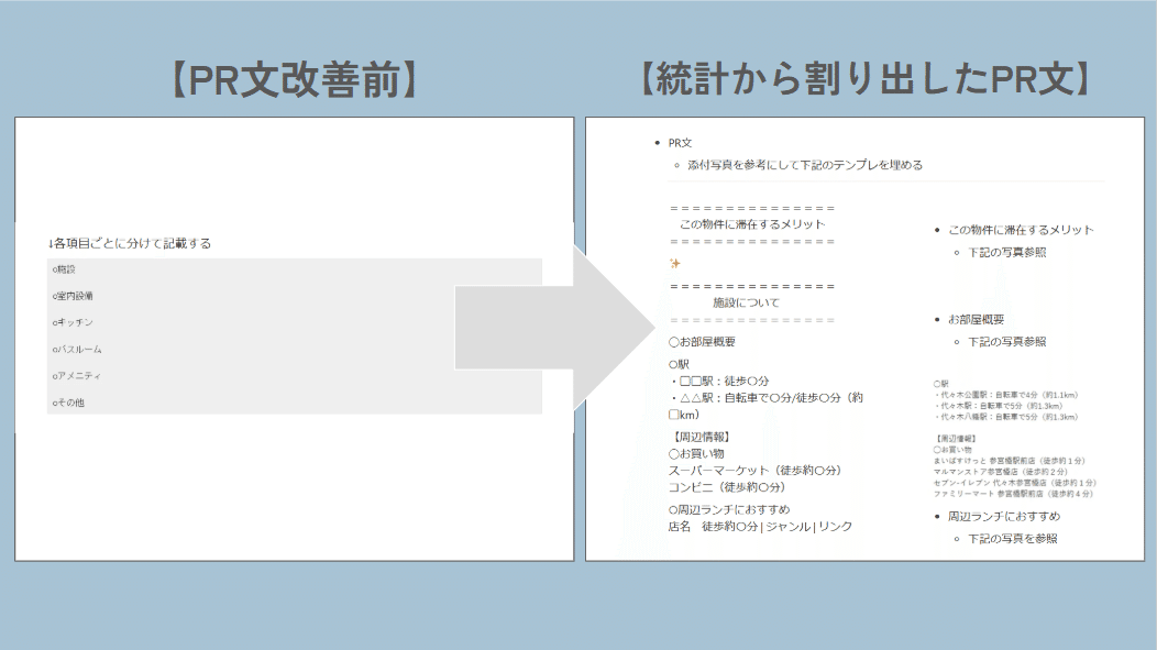 これまでリスティングに記載されるPR文は、作成者によって内容にばらつきがありました。そこで、"PR文変更後に申込があった物件" を「良いPR文」と仮定し、そのために追加で記載項目を担当チームにヒアリングしました。