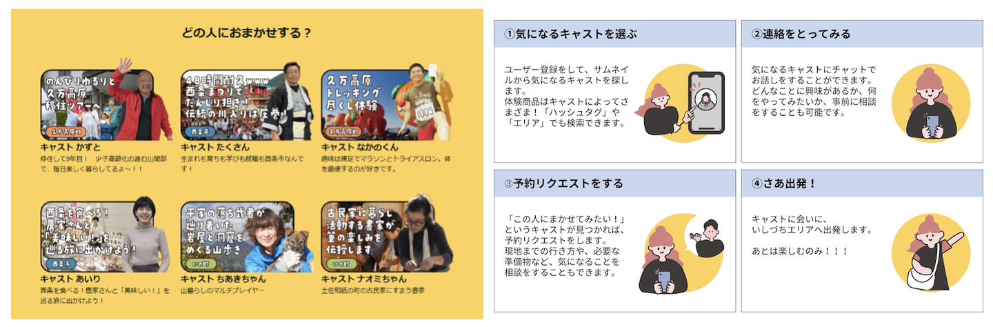人と人とをつないだ上で地域に来てもらい、その人の生業を体験できるマッチングサービス。旅行者を“ゲスト”、地域住民を“キャスト”と総称し、“キャスト”が提供する体験や交流を通じて、“ゲスト”がその土地の人々と深くつながることができます。“キャスト”とつながることで、地元の人しか知らない場所や、地域で面白いことをしている人などと出会い、普通では体験できない特別な旅を楽しむことができます。
