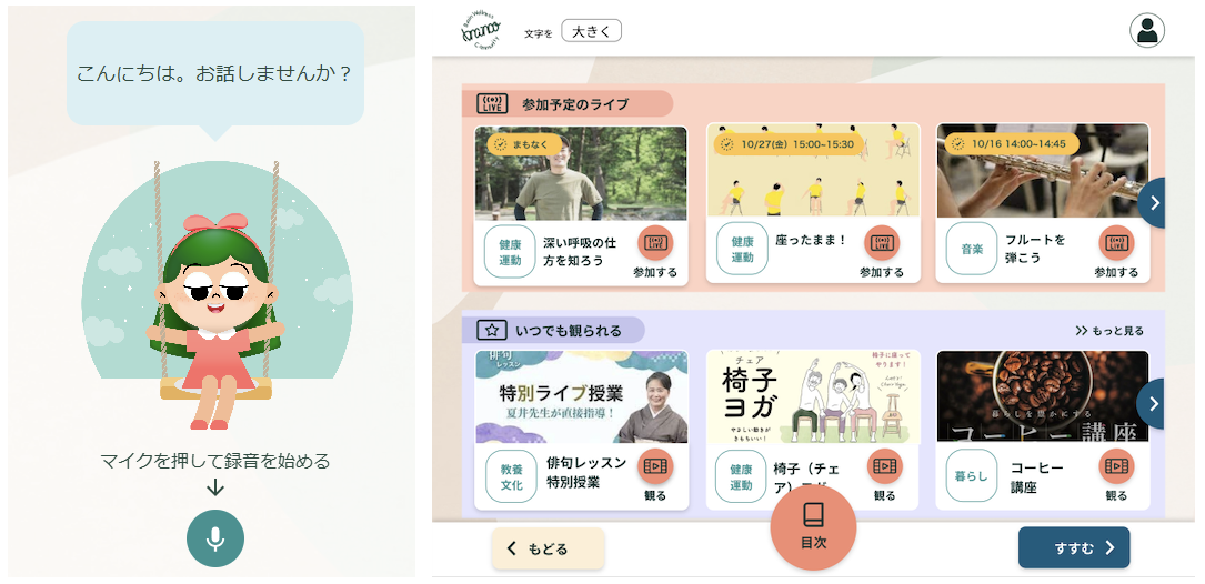 ご自宅にいながら、タブレットやパソコンを通して楽しく認知症を予防するプラットフォームです。AIとの会話を通して、新たな生きがいを発見したり、オンラインの会で地域の方々と一緒に、認知症やフレイル予防を行うことができます。お家時間を最大限に活かせる新たな認知症予防体験です。