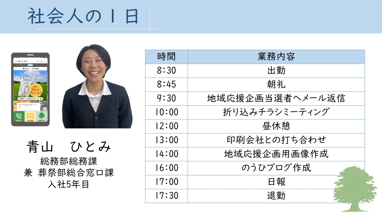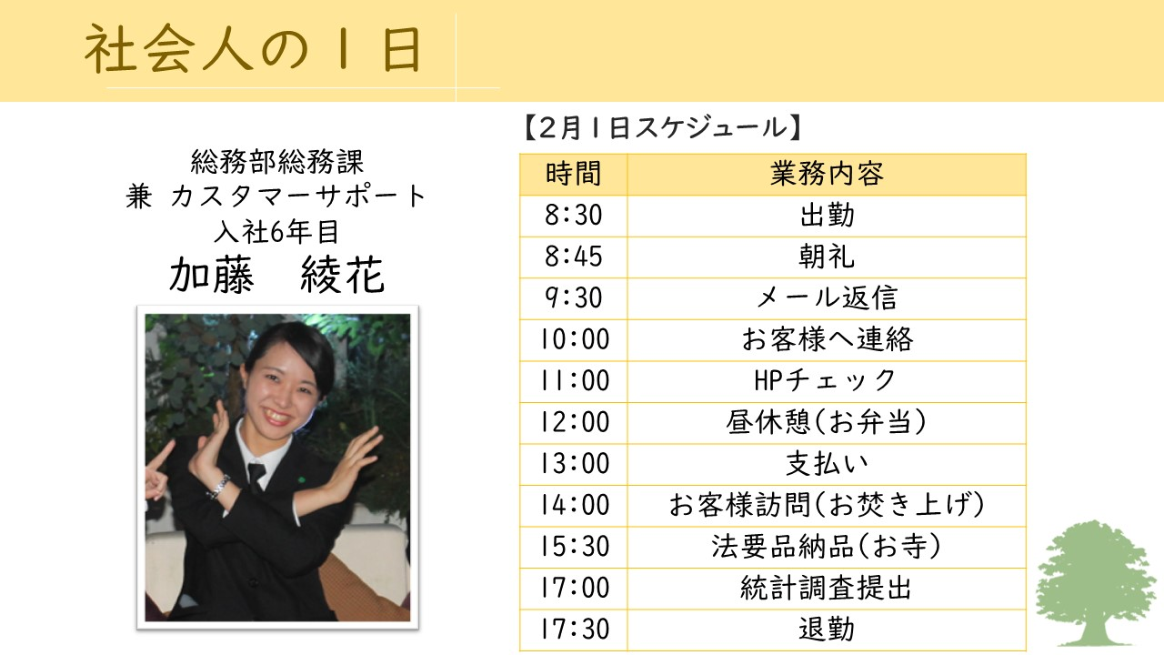 株式会社濃飛葬祭, 総務部総務課 「世界にも羽ばたかないし、モノも作りません」と言い切った社長に心動かされ、「この人たちとなら、毎日8時間一緒に働きたい」と思えたのうひ葬祭に新卒で入社しました。 愛知県名古屋市から岐阜県美濃加茂市に来て6年目。