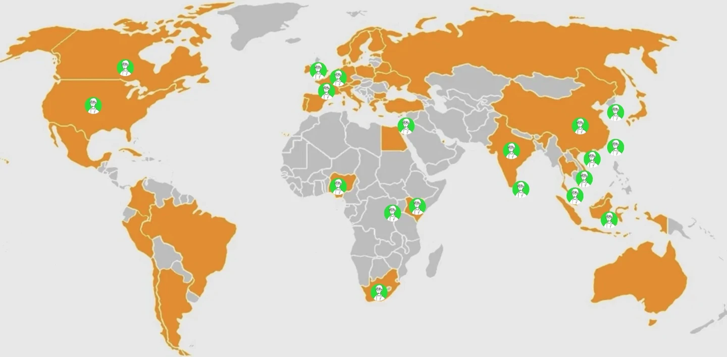 (下記地図のオレンジが島田が訪れた国、アイコンのついた国が私も訪れた都市です)