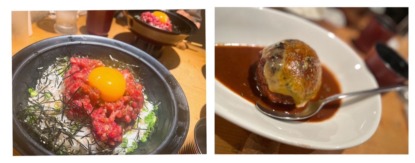 (写真)左:黒毛和牛炙りユッケ丼、右:飲めるハンバーグ