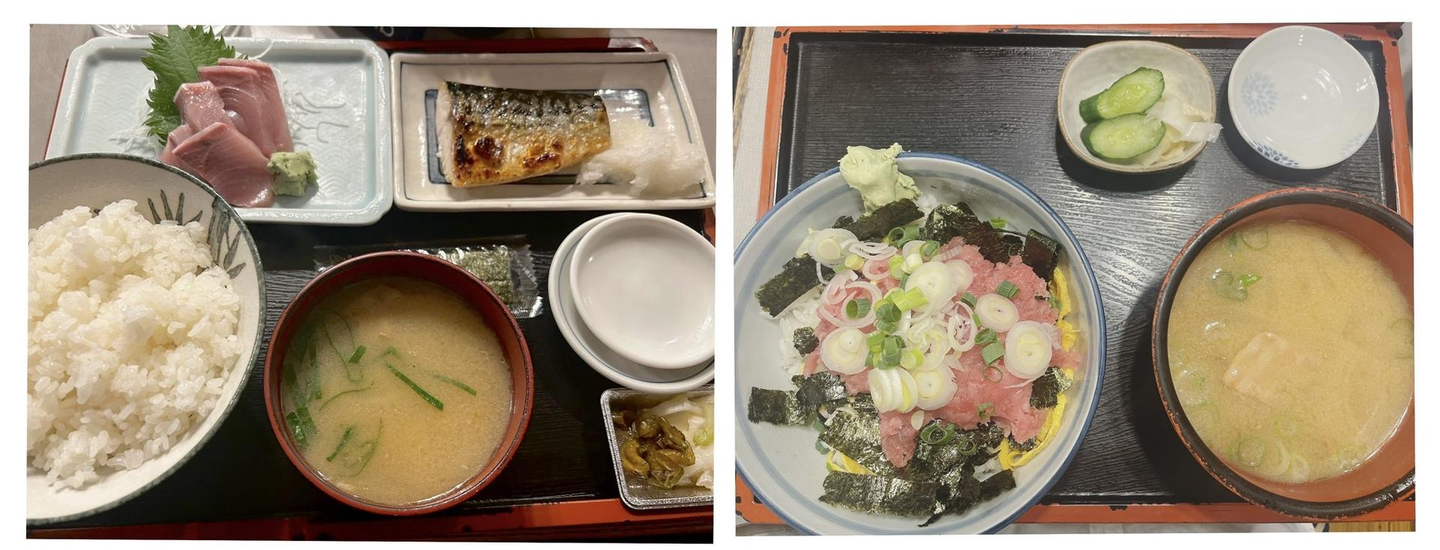 (写真)左:鯖の塩焼き定食、右:マグロ中落ち丼