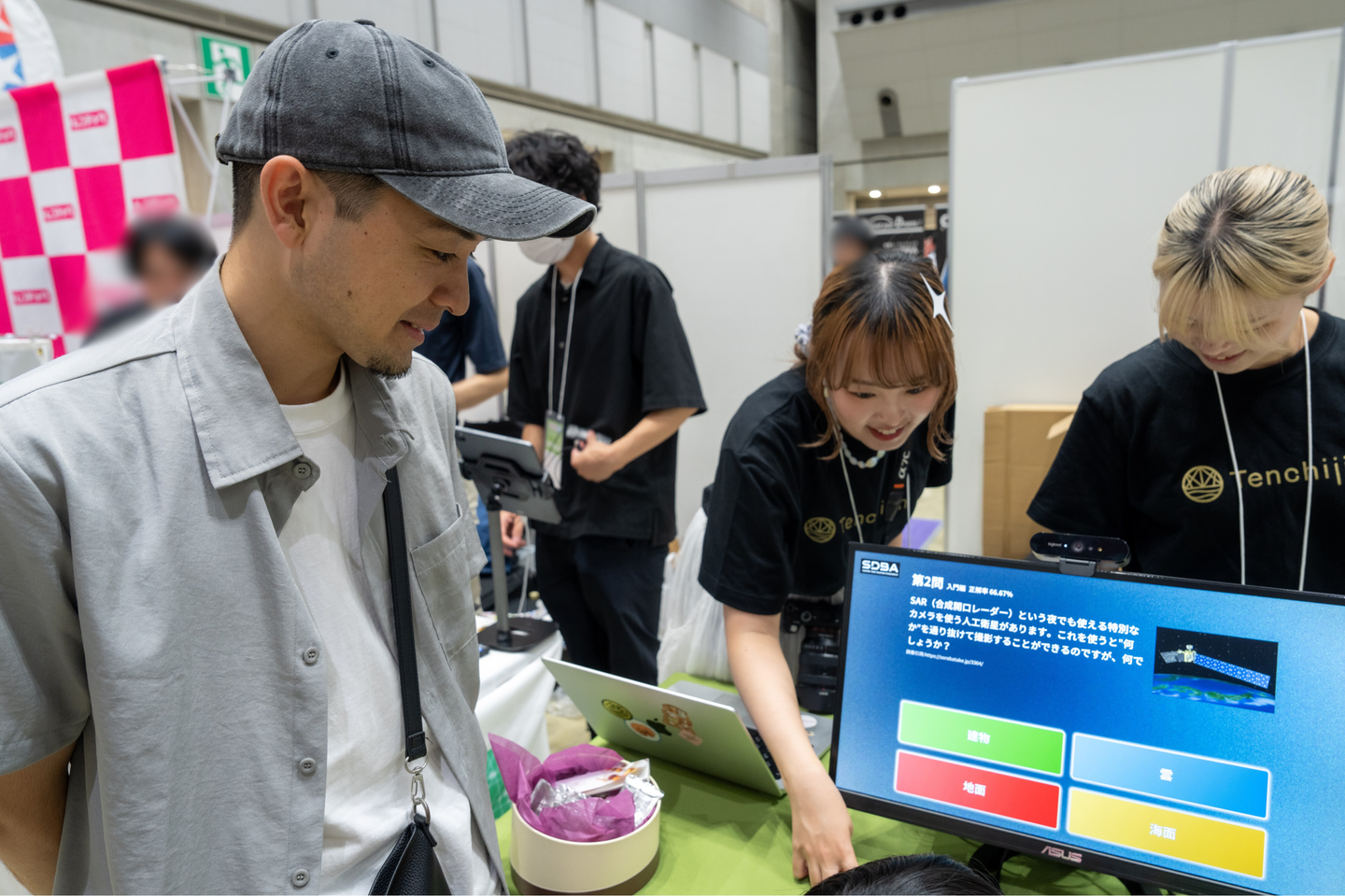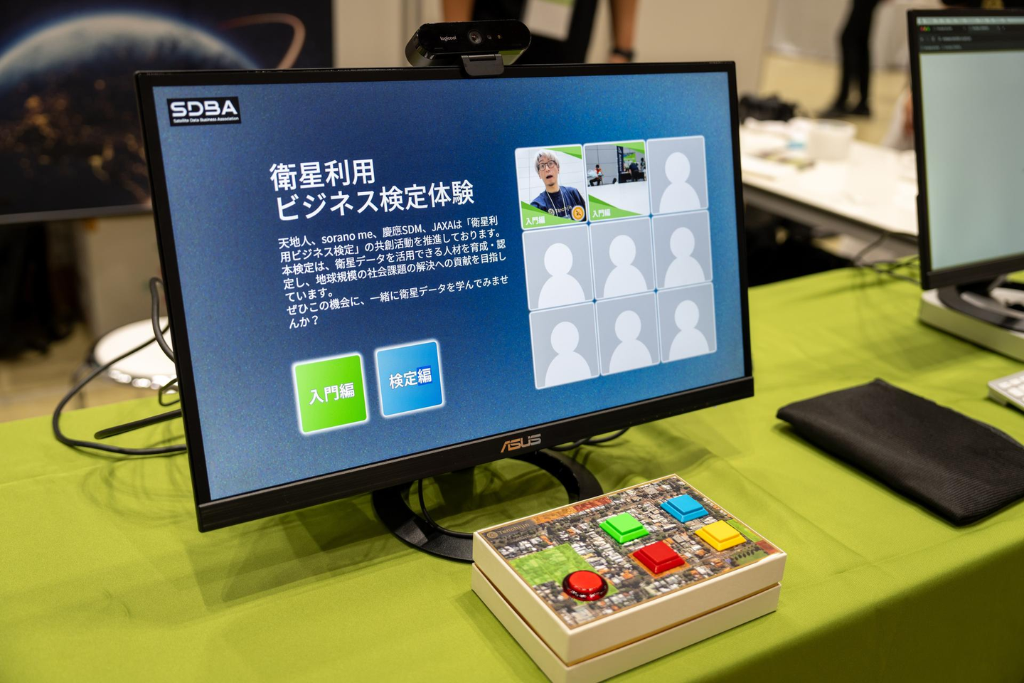 そして天地人コンパスの横に、「 衛星利用ビジネス検定体験 」を展示していました。実はこのクイズは、天地人と株式会社sorano meが中心となり、衛星データ利用人材拡大を目指し開発を進めている「 衛星利用ビジネス検定 」の体験版をクイズ形式で出しています。