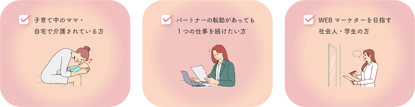 今春よりスタートする、【女性のためのWEBマーケティング大学】は、子育てや介護で外で働けない、パートナーの転勤で1つの仕事が続けられない…
