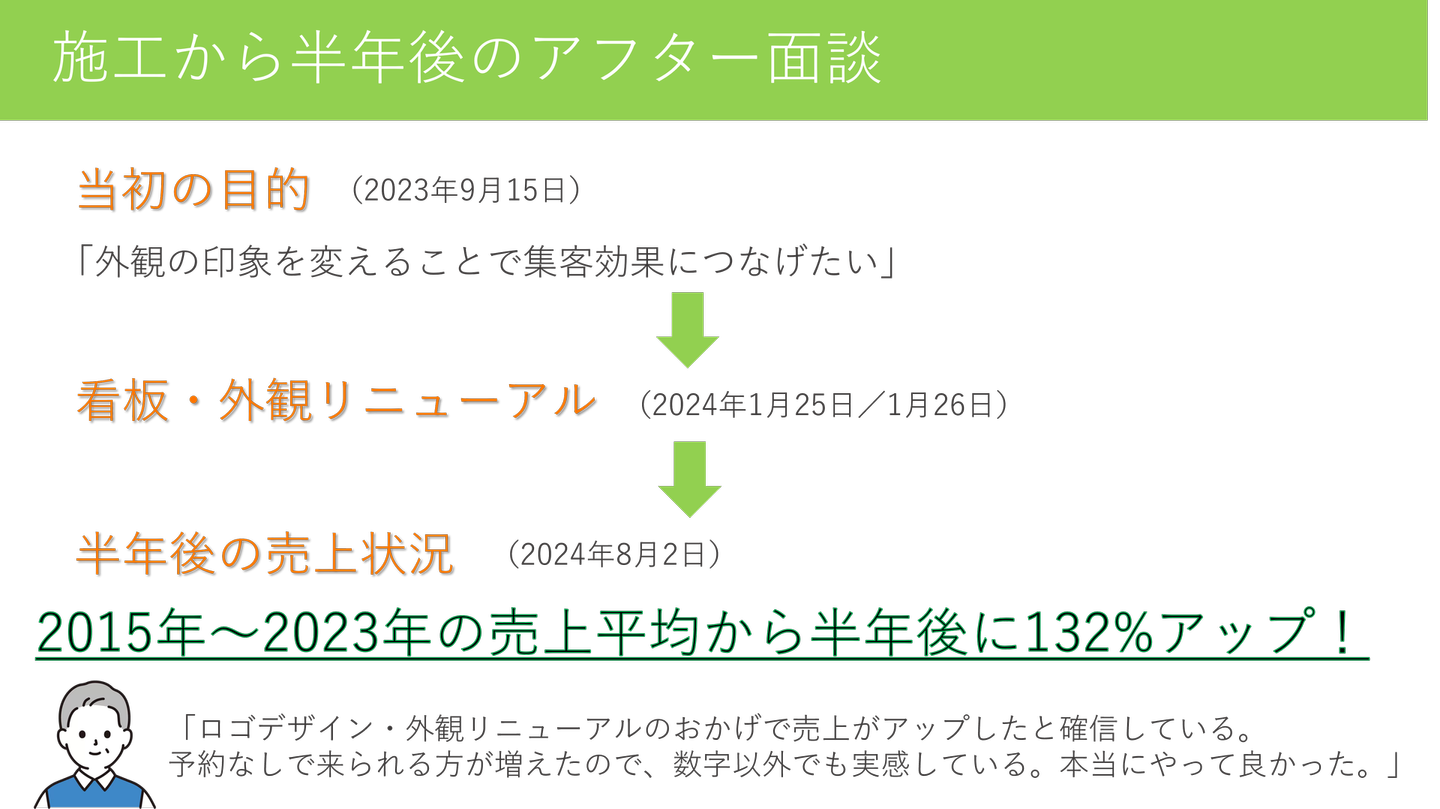 成果の確認をしたところ「去年までの売上平均より132%アップしました」とのことで、当初の目的を果たすことができました。お客様は「現状に満足せず、もっとお客様を増やしていきたい」とおっしゃっていたので、引き続きアフターフォローを行っています。