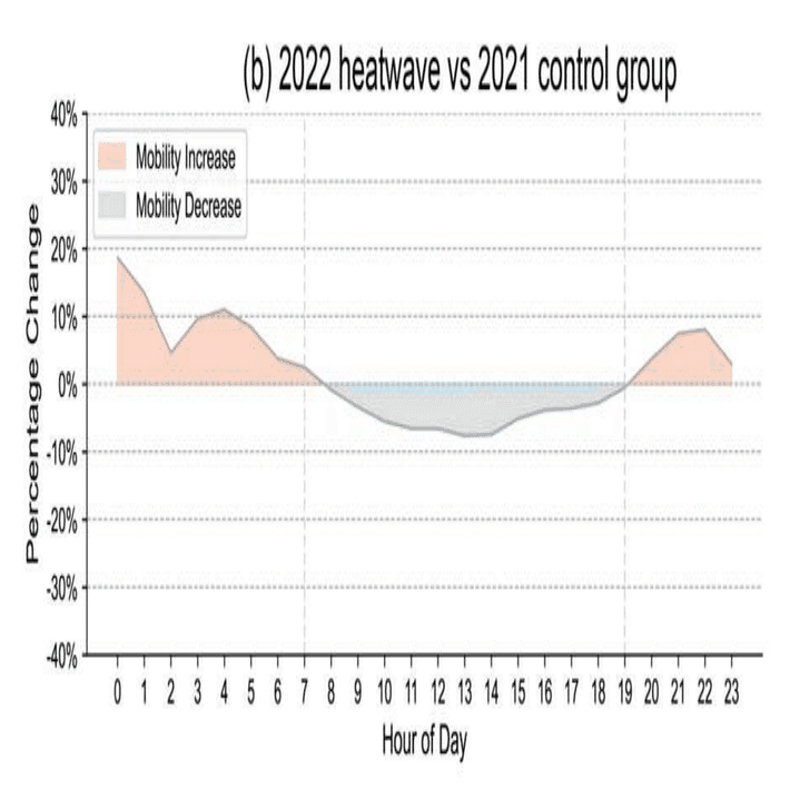 グラフから熱波発生時は人々の移動が約10%減少することがわかります。特に通勤ラッシュの朝、正午、午後5時で移動量が顕著に落ち込んでいることから、通勤などで移動する時間帯を調整したり、最小限に抑えたりすることで暑さへの曝露を回避している可能性があることがわかります。