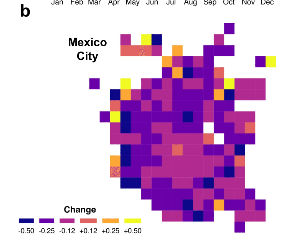 下の図bはメキシコシティでの猛暑による人々の移動量の変化を示しており、大きく減少している地域(青、紫)が多いことがわかります。