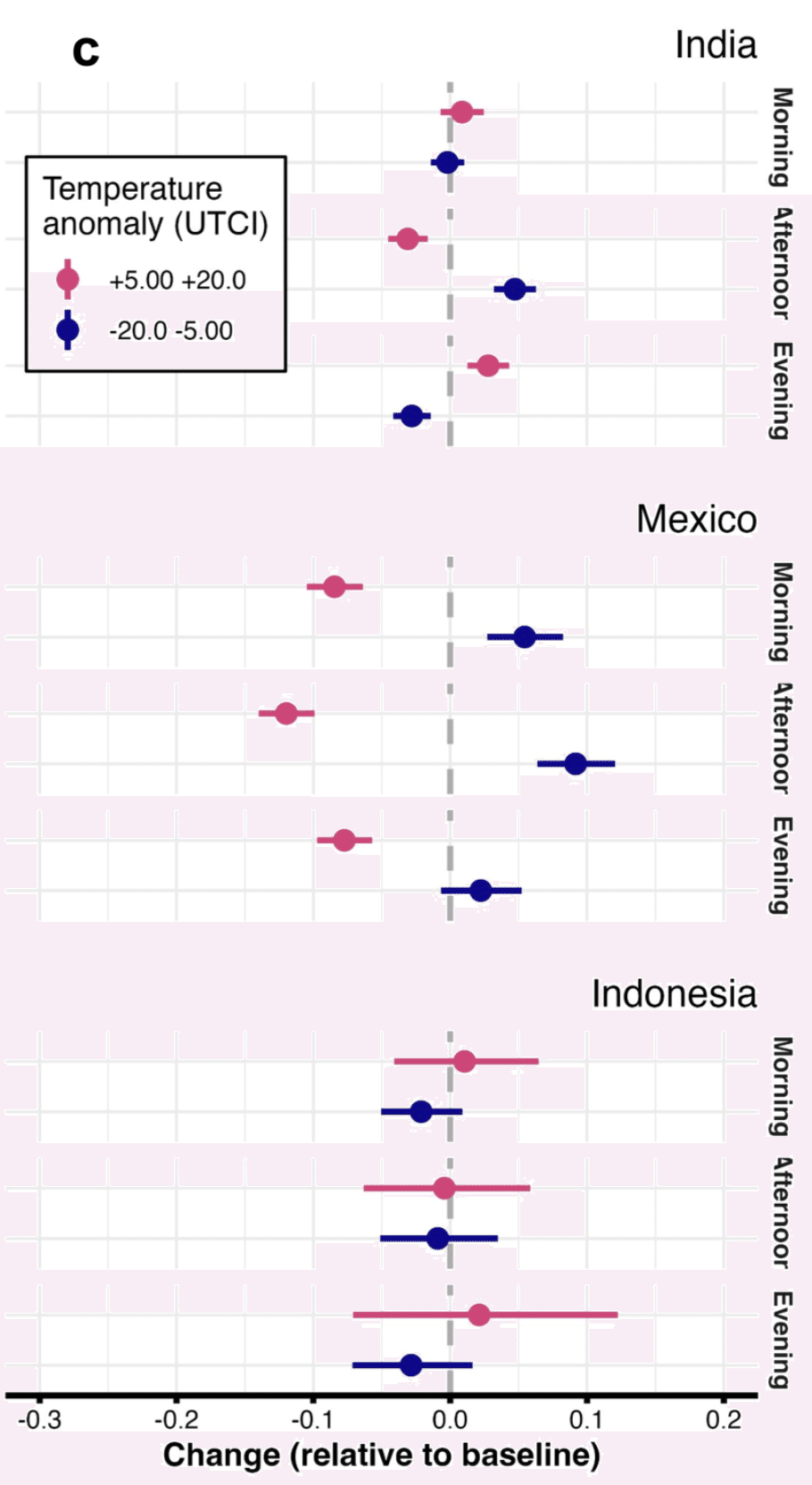 一方、インドネシアでは標準誤差が大きいことから、気温変化の影響が個人によって異なり、明確な傾向は確認できません。