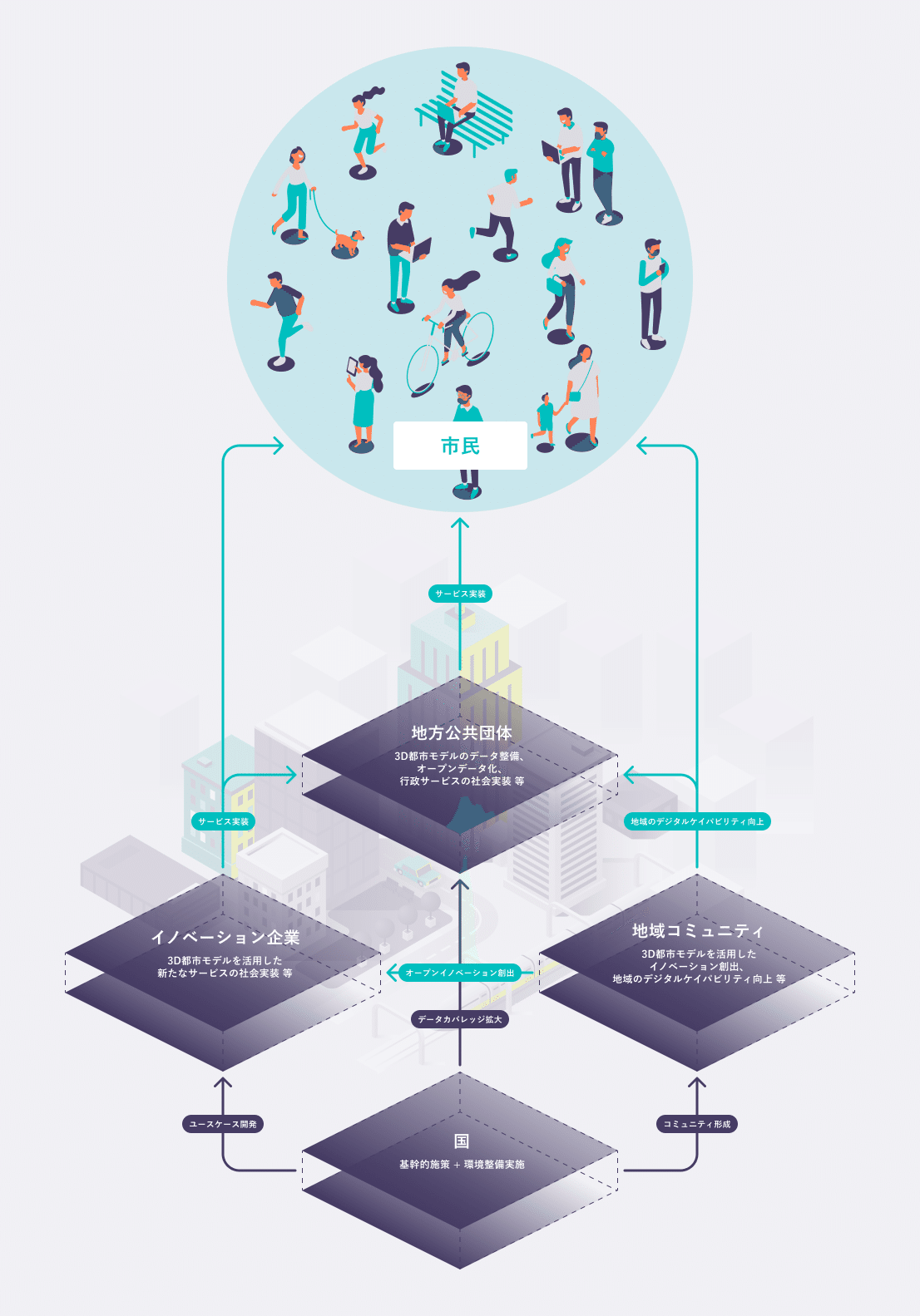 都市のDX(デジタルトランスフォーメーション)やスマートシティ化を支えるため、民間企業、自治体、大学、研究者、エンジニア、クリエイターなど、多様なプレイヤーと共創しながら進められています。