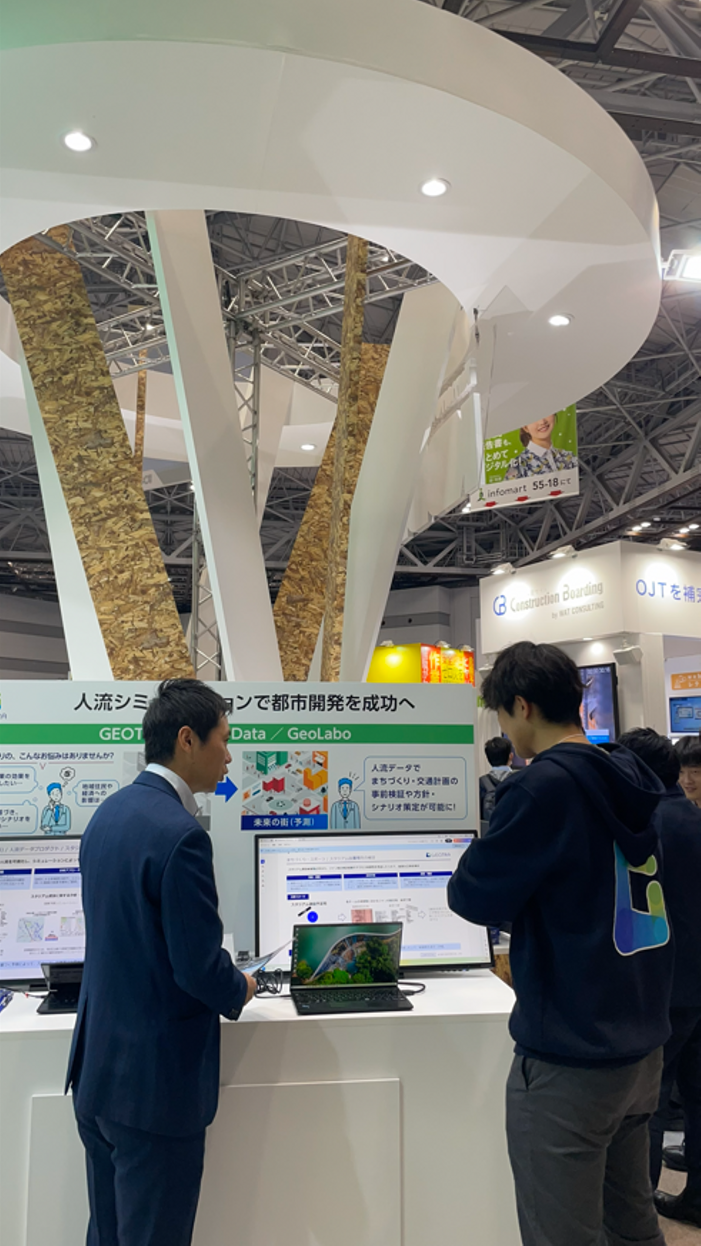 今回、GEOTRAはKDDIブース内で、建設・都市開発分野における人流データ活用のユースケースを中心に展示を行いました。