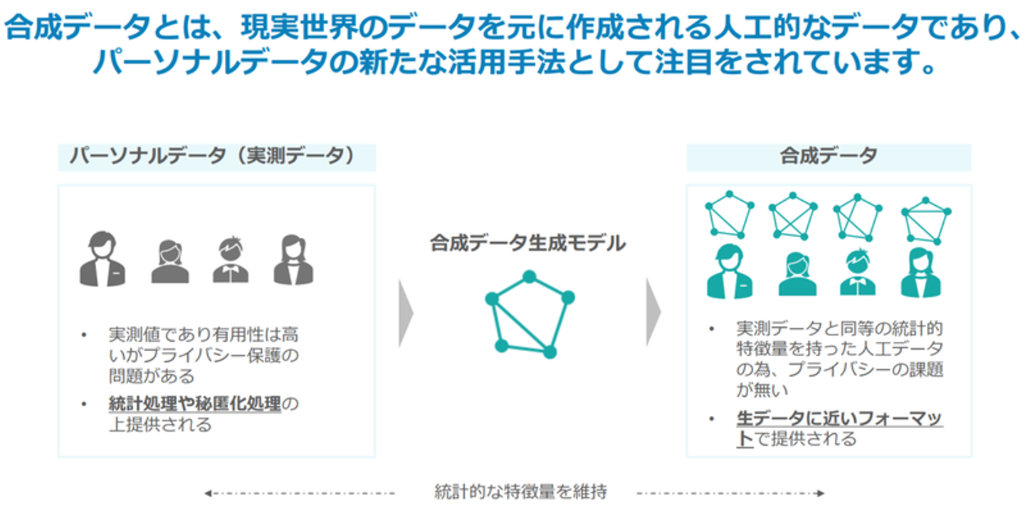 合成データは、コンピューターのアルゴリズムによって生成され、現実世界での統計的な特徴量を維持した限りなく実際のデータに近い人工的なデータであるため、プライバシーの課題をクリアし、高精度かつ生データに近いフォーマットを利活用することができます。