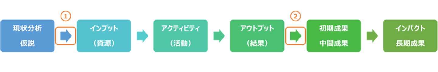 EBPMに留意した事業推進を行うためのサイクルとして、「ロジックモデル」が利用されています。ロジックモデルとは、政策・事業の実施により、目的が達成されるまでの因果関係を明示するものです。