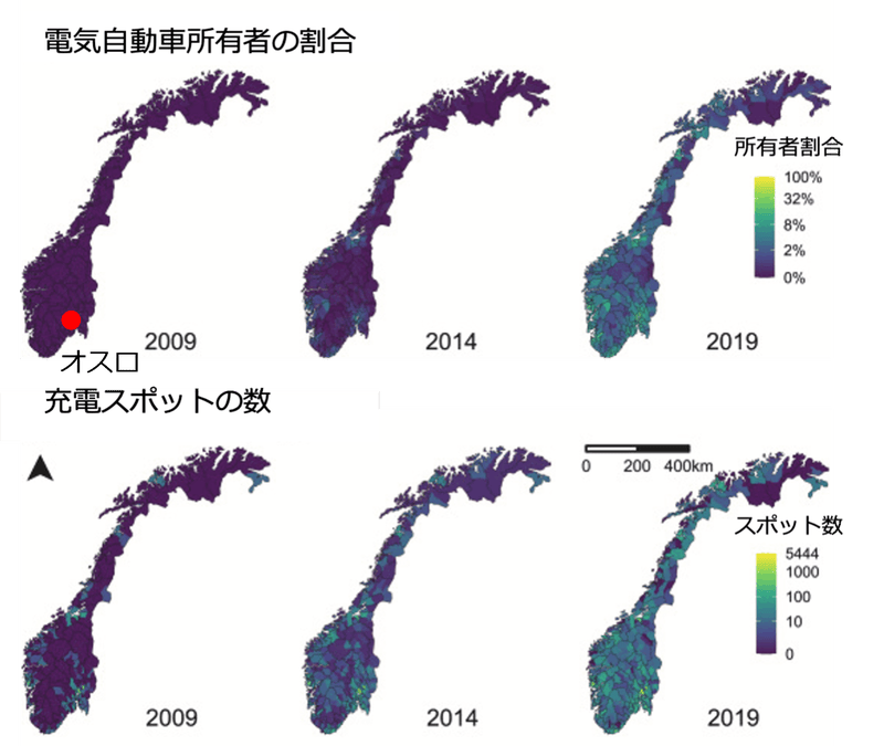 図1,2は、ノルウェー全土におけるEV所有者の割合、及び充電スポット数の増加の推移を示しています。図1の通り、首都オスロを中心に増加していることが分かります。