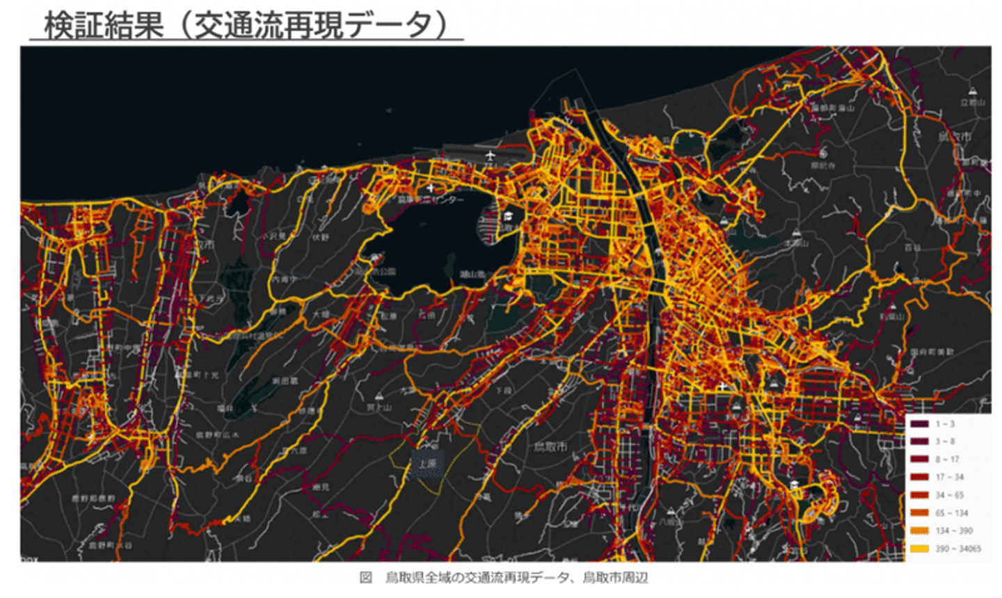説明責任を果たす上で、“データの精度”が問われるため、鳥取県内各地に設置されているトラフィックカウンターデータ(定点観測でその地点を通過する車両台数を計測するシステム。以下、トラカン)と、GADを突合の上、比較検証し、GADの一定の有意性が確認されました。
