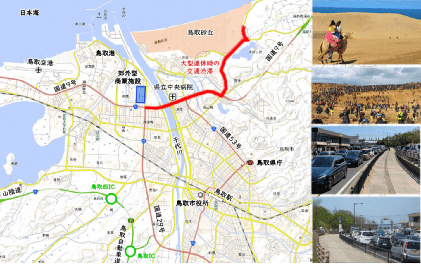 観光地の一つである鳥取砂丘では、大型連休時には1日2〜3万人が訪れ、周辺の高速道路や国道と鳥取砂丘を結ぶ道路では渋滞が発生しています。