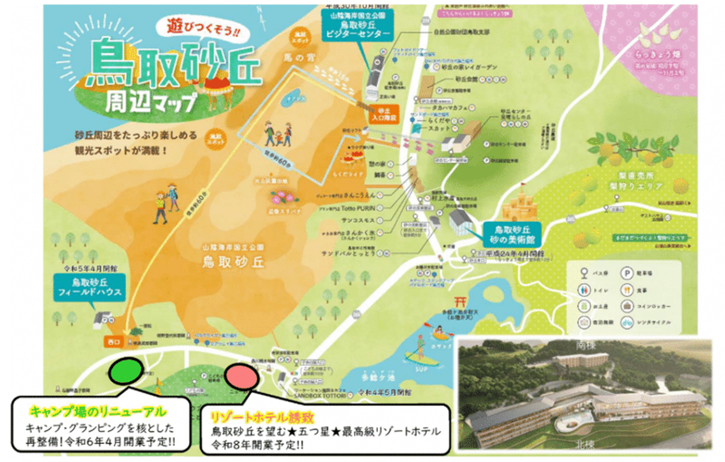鳥取砂丘近くでは、令和6年にキャンプ場のリニューアル、令和8年にリゾートホテルの開業が見込まれており、インバウンド需要を含め、より多くの観光客が来訪することが見込まれます。