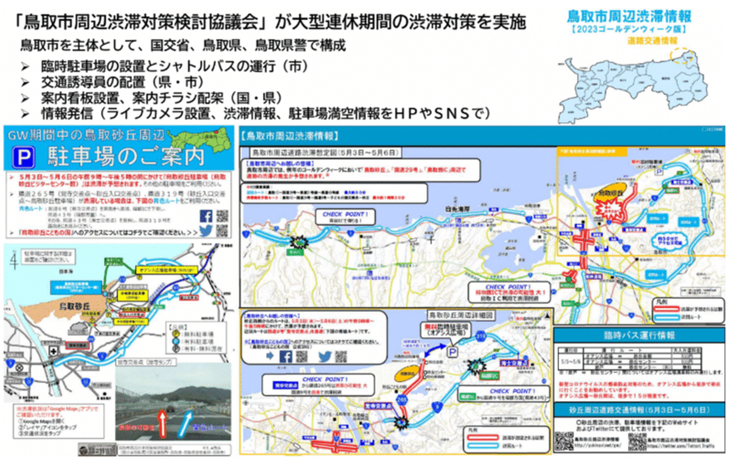 鳥取県は、鳥取市を主体として国土交通省や鳥取県警と連携しながら大型連休期間の渋滞対策を行ってきました。