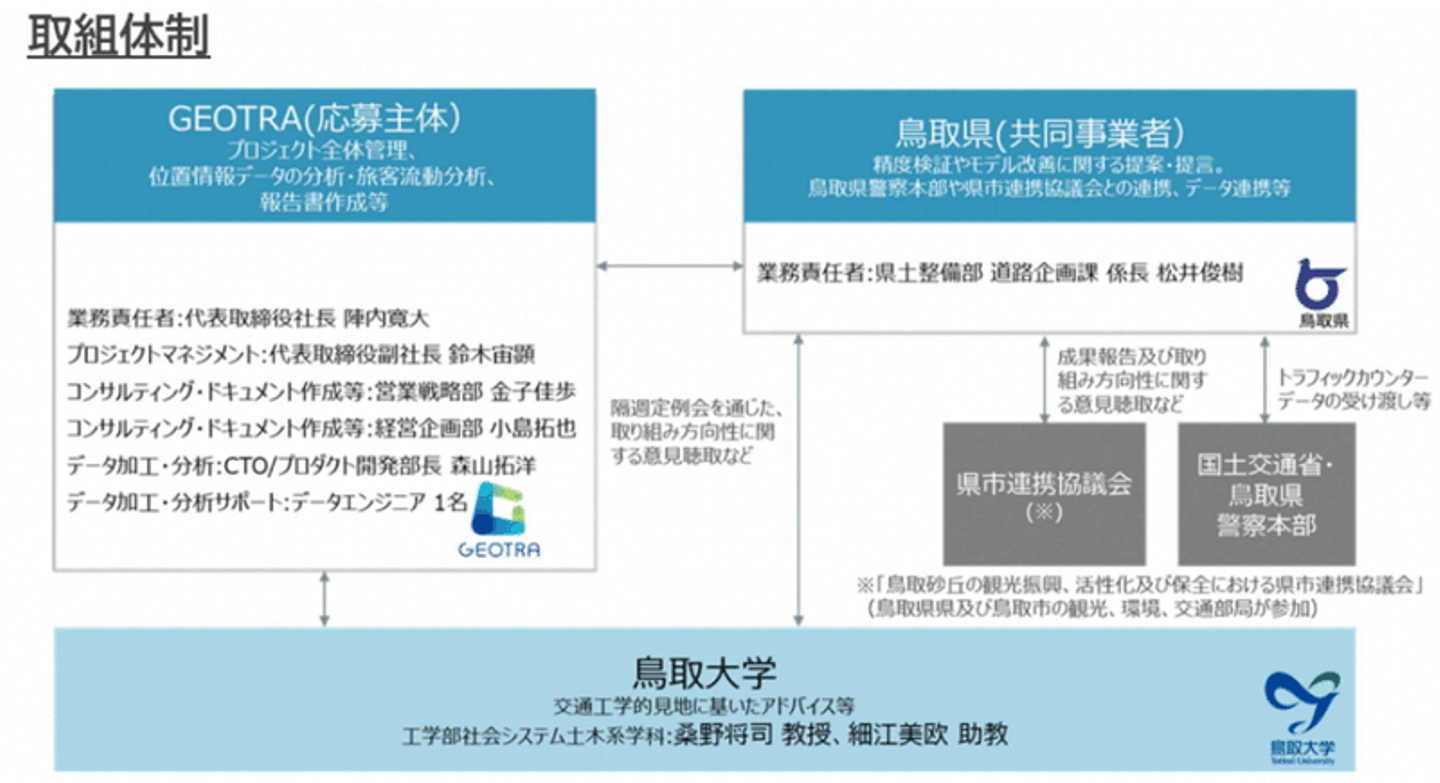 そこで、効率的なビッグデータを活用すべく、GEOTRAとのプロジェクトが始動しました。本プロジェクトは交通工学的見地を有する鳥取大学の先生方にもご協力頂きながら、産官学連携で推進しました。
