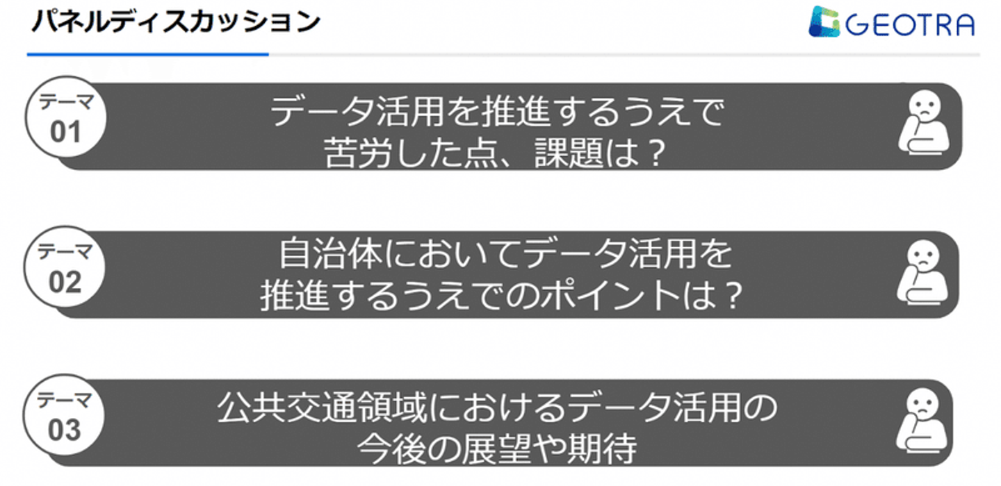 パネルディスカッションでは、以下のテーマを中心に、まちづくりに携わるGEOTRA、鳥取県様の議論を展開しました。